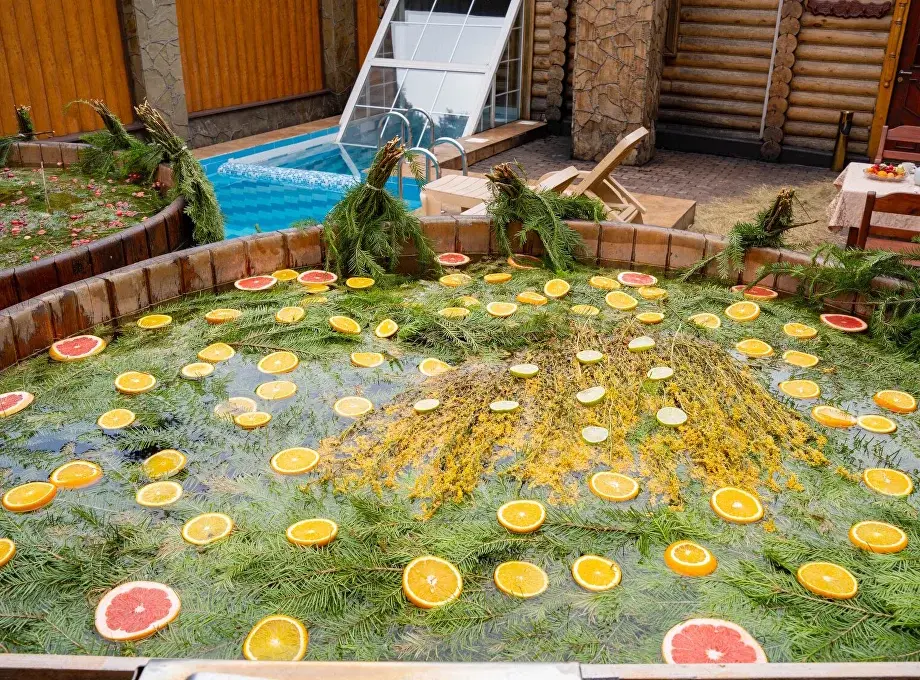 Полный комплект банной одежды, включая индивидуальные банные купальники. Украшение парной и полков сеном и душистыми травами. Закуски и напитки -Русский стол 1-й заход - арома прогрев лимонный. 2-й заход - прогрев вениками с апельсиновым паром, контрастные процедуры по выбора Гостя. 3-й заход - парение с растиранием медом, цитрусовые охлаждение. Купель "Цитрусовая" В завершении программы - трапеза блюдами русской кухни. (за 2-х Гостей 73 000 р; далее 25 000 р за Гостя; до 12 Гостей)